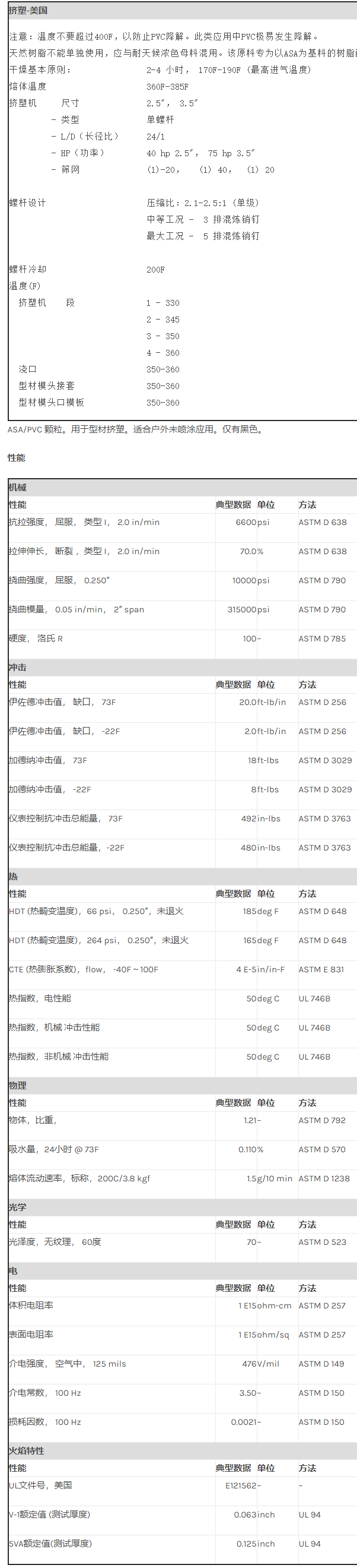 应用范围: 产品描述 Geloy ASA GY1220物性表 ASA/PVC 颗粒。用于型材挤塑。适合户外未喷涂应用。仅有黑色。 加工