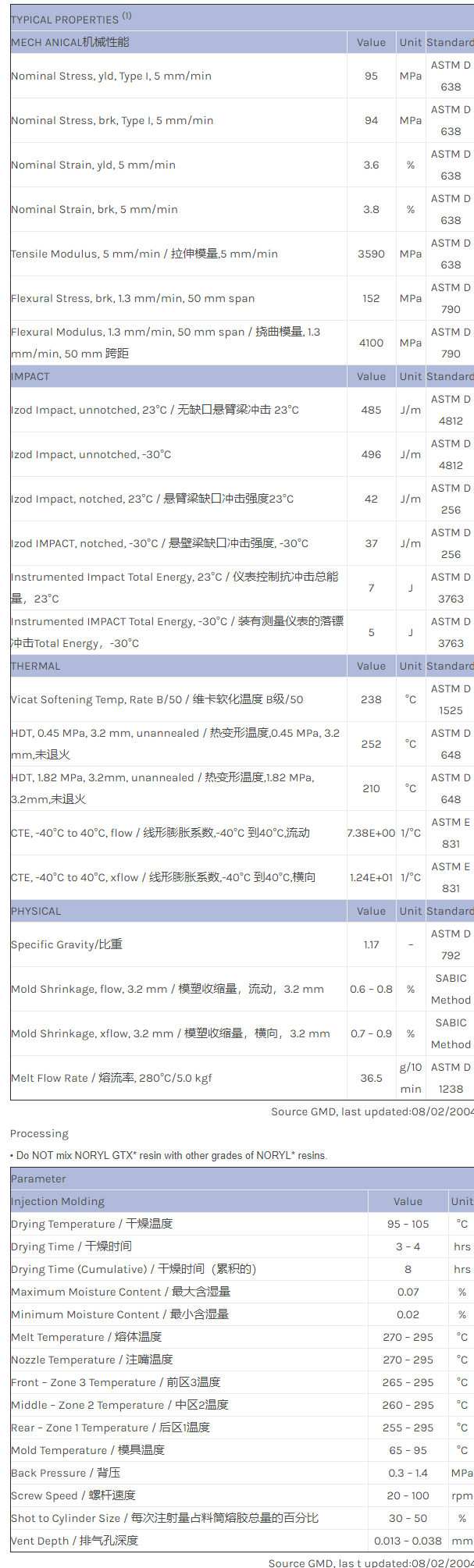 应用范围:产品描述NORYL GTX GTX8410W物性表High flow, 10% Glass Reinforced PPE+PA. Typically used in Automotive connectors.