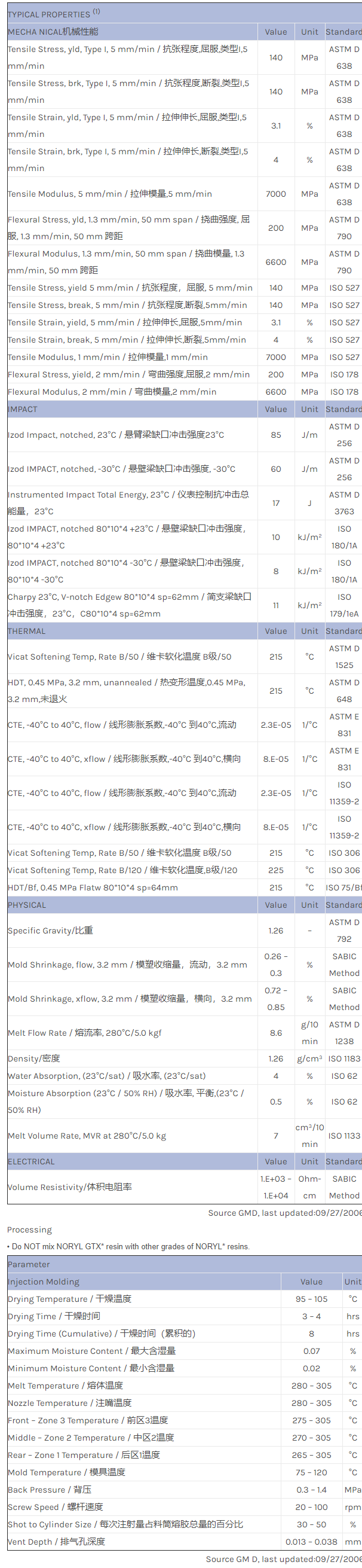 应用范围:产品描述NORYL GTX GTX8720物性表Noryl GTX* GTX8720 resin is a glass filled, high performance blend of PPE/PA that exhibits an excellent balance of high-heat resistance, strength, flow, and conductivity. This