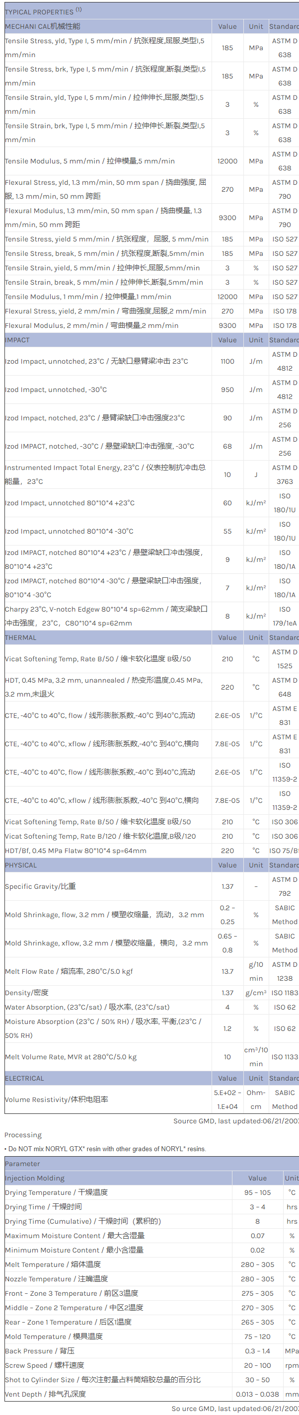 应用范围:产品描述NORYL GTX GTX8730物性表Noryl GTX* GTX8730 resin is a glass filled, high performance blend of PPE/PA that exhibits an excellent balance of high-heat resistance, strength, flow, and conductivity. This