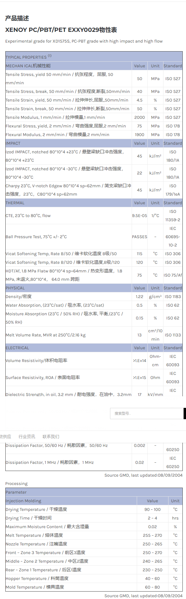 应用范围:产品描述XENOY PC/PBT/PET EXXY0029物性表Experimental grade for XD1575S, PC-PBT grade with high impact and high flow