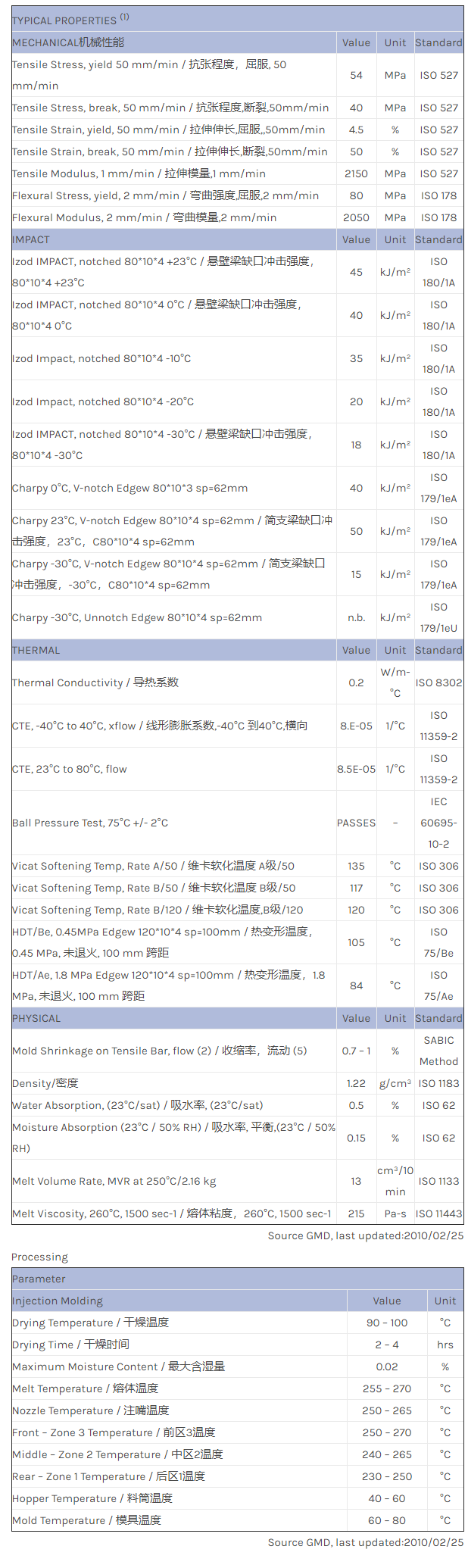 应用范围:产品描述XENOY PC/PBT/PET X5100物性表XENOY X5100是一种聚碳酸脂+聚酯(PC+聚酯)材料,加工方式为:注射成型。