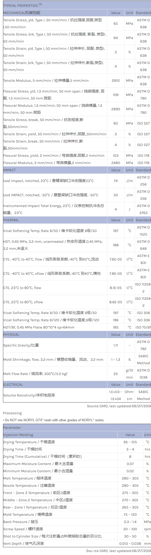 应用范围:产品描述NORYL GTX GTX674PC物性表A conductive PPE/PA blend designed to have improved surface appearance and elevated heat resistance for powder coating. The material is suitable for injection molding. The mat