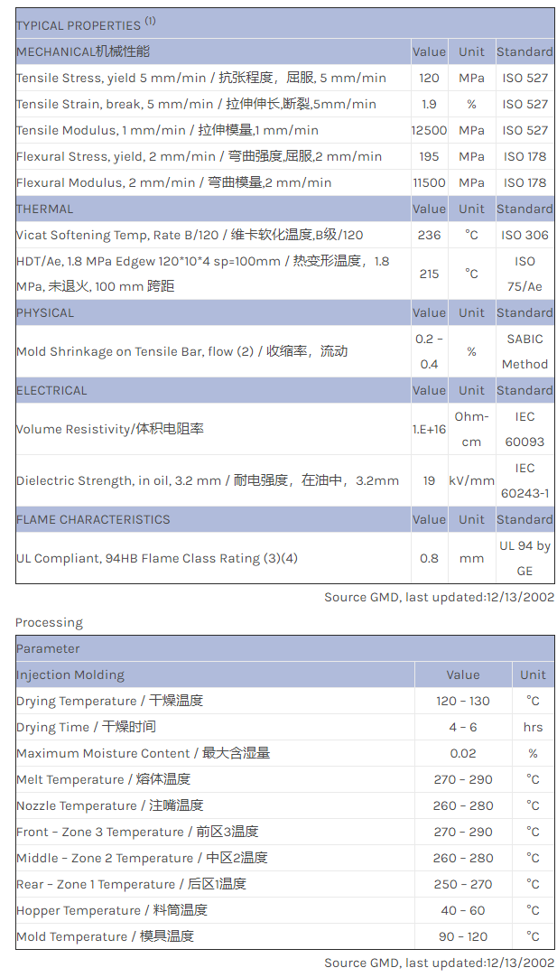 应用范围:产品描述Valox PBT EXVX1113物性表EXVX1113 is a 40% Glass / Mica reinforced polyethylene terephtalate with low warpage, higher strength and improved electrical properties.