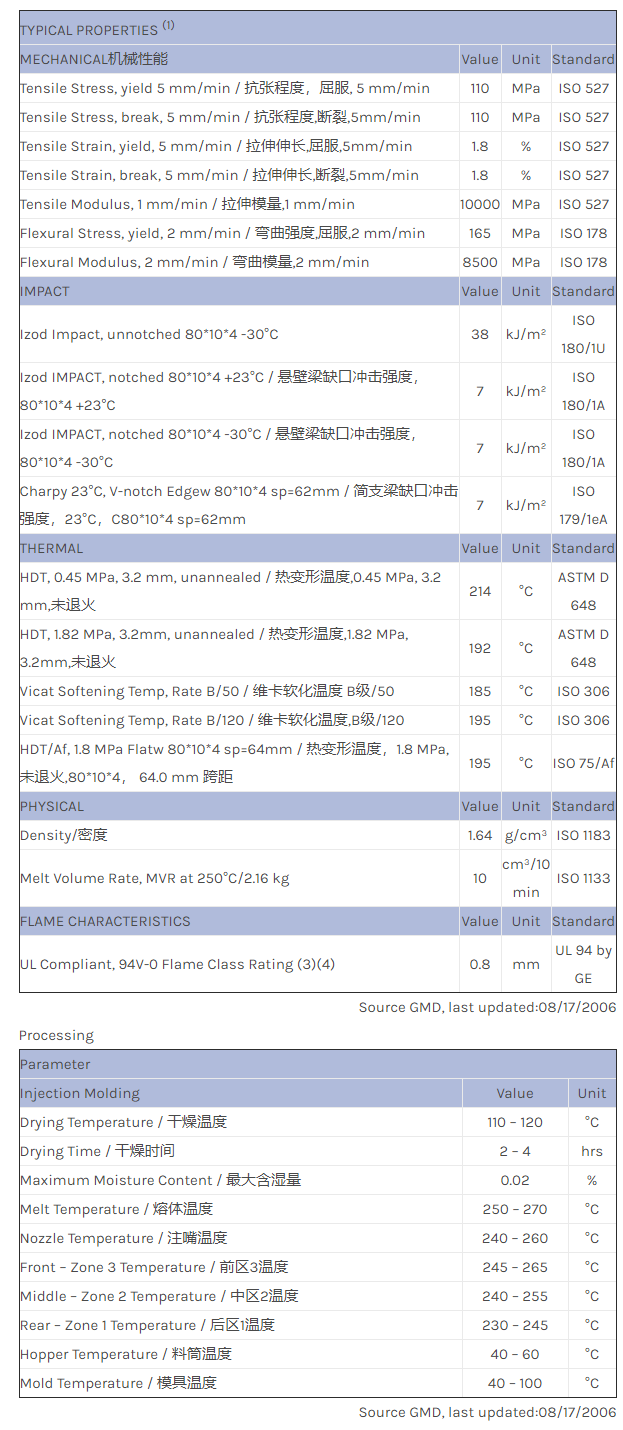 Valox Super high flow grade, 30% glass filled Flame retardant, heat stabilized with mold release.
