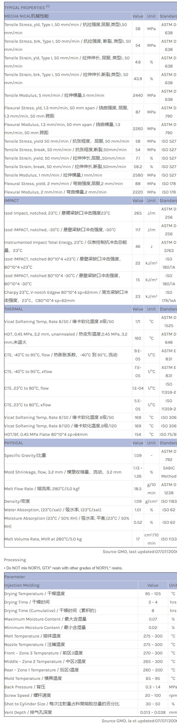 应用范围:产品描述NORYL GTX GTX942物性表Noryl GTX* GTX942 Resin is a blend of Polyphenylene Ether(PPE) + Polyamide(PA) resin that is designed to have high melt flow for large part/thinwall injection molding. The mater