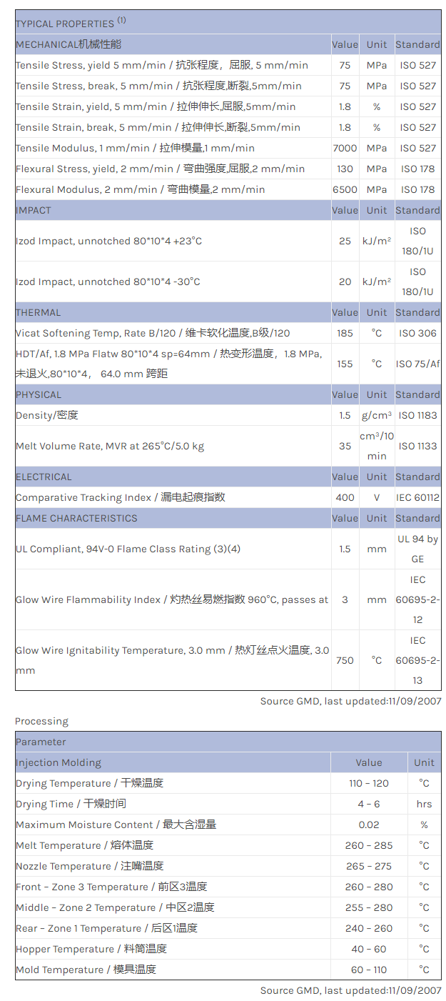 应用范围:产品描述Valox PBT EXVX1294物性表Non-Brominated & Non-Chlorinated Flame Retardant, 15% Glass fiber reinforced PBT/PET blend