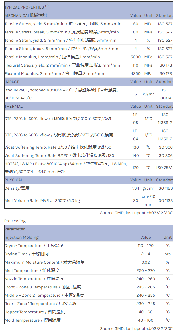 15% Glass reinforced nucleated PBT/ASA with excellent MECHANICAL机械性能 properties high dimensional stability, and low Density/密度.
