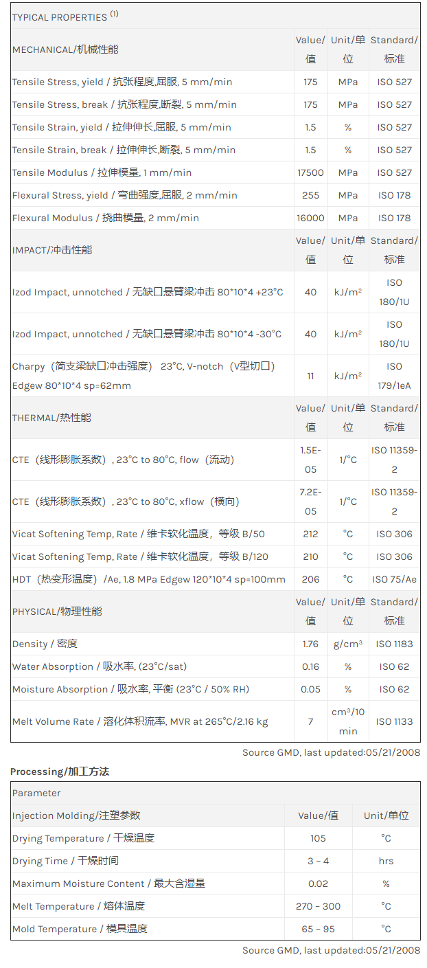 “Valox V8090 resin是一种聚对苯二甲酸丁二酯+PET(PBT+PET)材料,含有的填充物为50%玻璃纤维增强材料,加工方式为:注射成型。