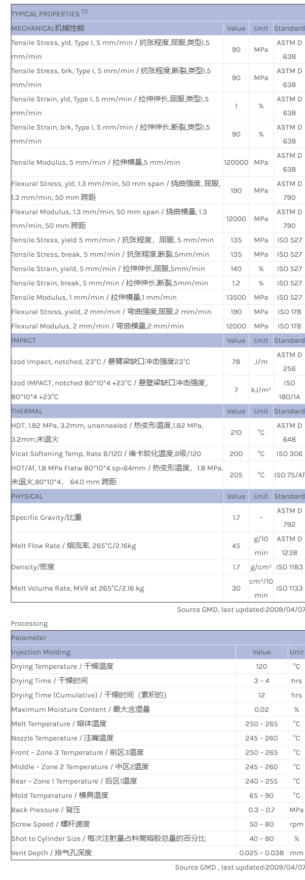 应用范围:产品描述VALOX PBT V8280SF物性表High Modulus, PBT+PET, 40% Glass Reinforced, Mold Release, Super High Flow