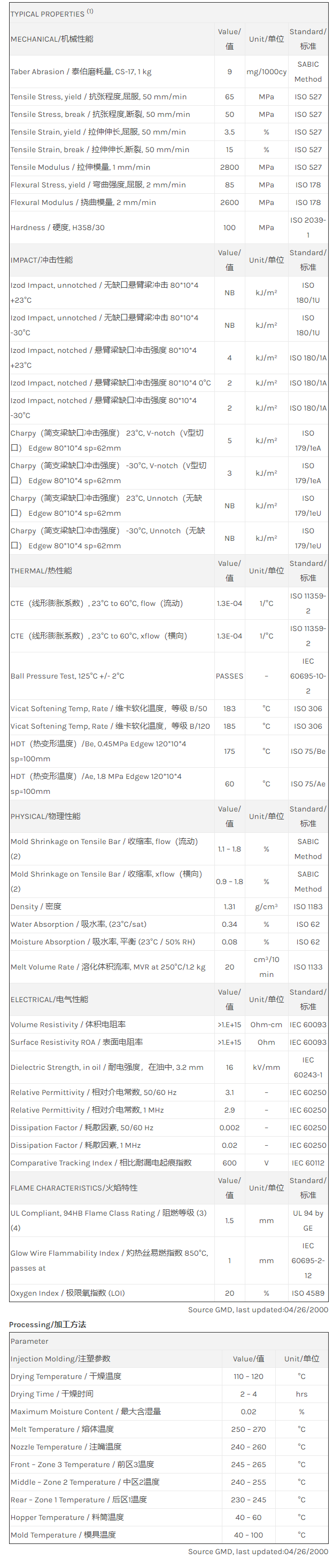 应用范围: 产品描述 Valox PBT VX3101N物性表 “Valox VX3101N resin是一种聚丁烯对苯二甲酸酯(PBT)材料,加工方式为:注射成型。 Valox VX3101N resin的主要特性有: 良好的流动性 阻燃/额定火焰 通过 ROHS 认证 耐化学品 水解稳定性 ” VALOX VX3101N is an unreinforced PBT injecti