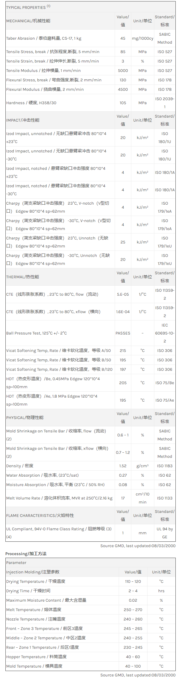 “Valox VX4510 resin是一种聚丁烯对苯二甲酸酯(PBT)材料,含有的填充物为10%玻璃纤维增强材料,加工方式为:注射成型。