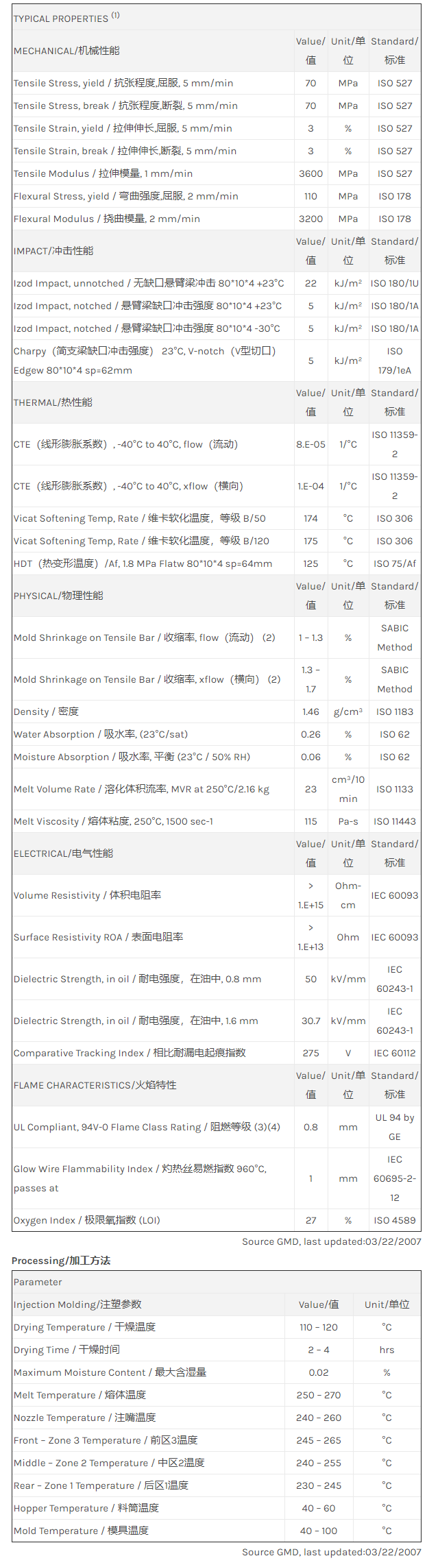 “Valox SHF4910 resin是一种聚丁烯对苯二甲酸酯(PBT)材料,含有的填充物为6.5%玻璃纤维增强材料,加工方式为:注射成型。