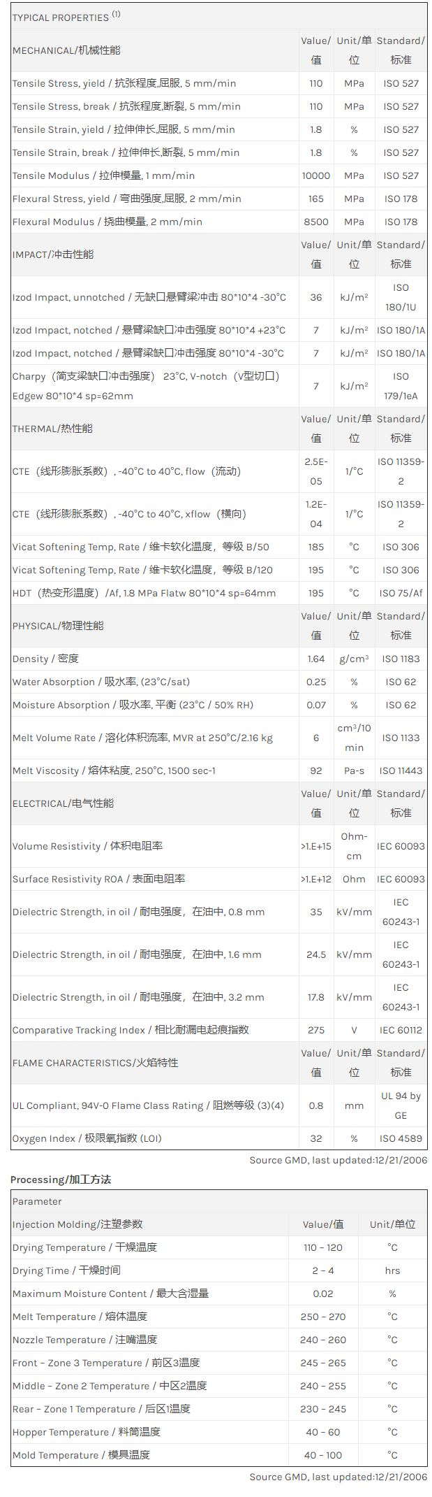 应用范围: 产品描述 Valox PBT SHF4960物性表 “Valox SHF4960 resin是一种聚丁烯对苯二甲酸酯(PBT)产品,含有的填充物为30%玻璃纤维增强材料,可以通过注射成型进行加工。 特性包括: 阻燃/额定火焰 Flame Retardant 高流动性 热稳定剂 脱模剂 ” Valox Super high flow grade, 30% glass fill