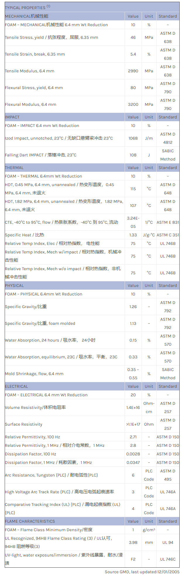 壁厚0.250″时20%减重数据。10% 玻纤增强。改良的韧性、耐化学剂性,低翘曲。非阻燃。
