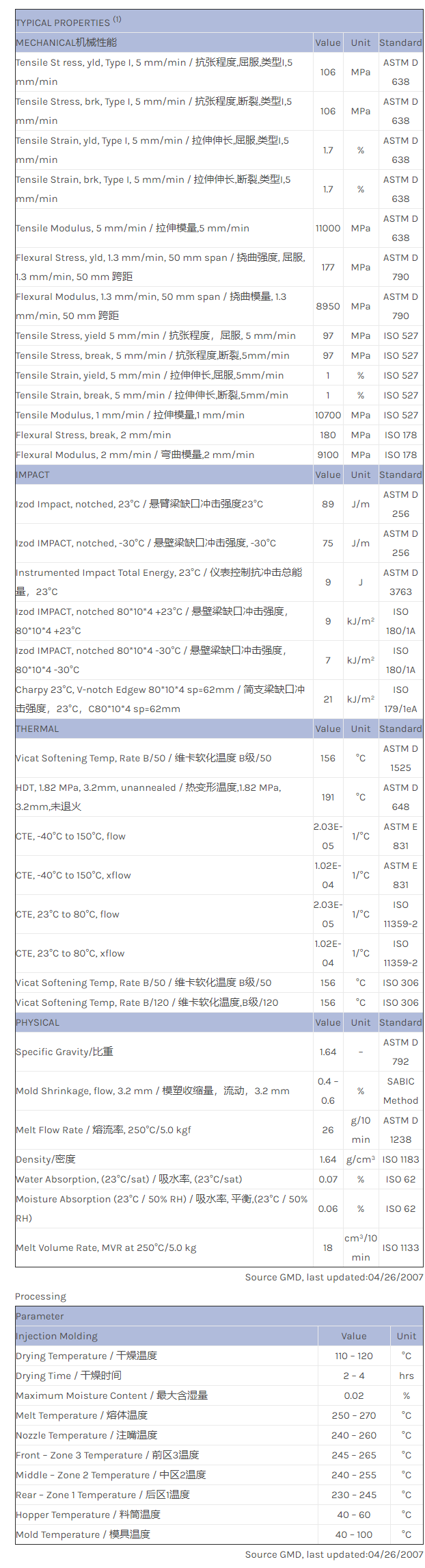 应用范围:产品描述Valox PBT EXVX1258物性表Valox iQ4860HR (EXVX1258) is an environmental responsible flame retarded, 30% glass fiber reinforced PBT injection moulding resin.