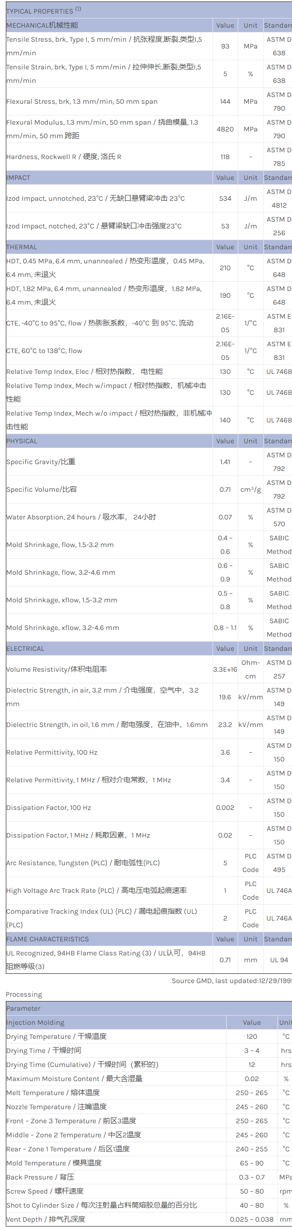 应用范围:产品描述Valox PBT DR51M物性表15% 玻纤增强。优异的机械/热/电气性能。非阻燃。聚光灯、器具外壳、把手。易于流动/内含脱模剂。