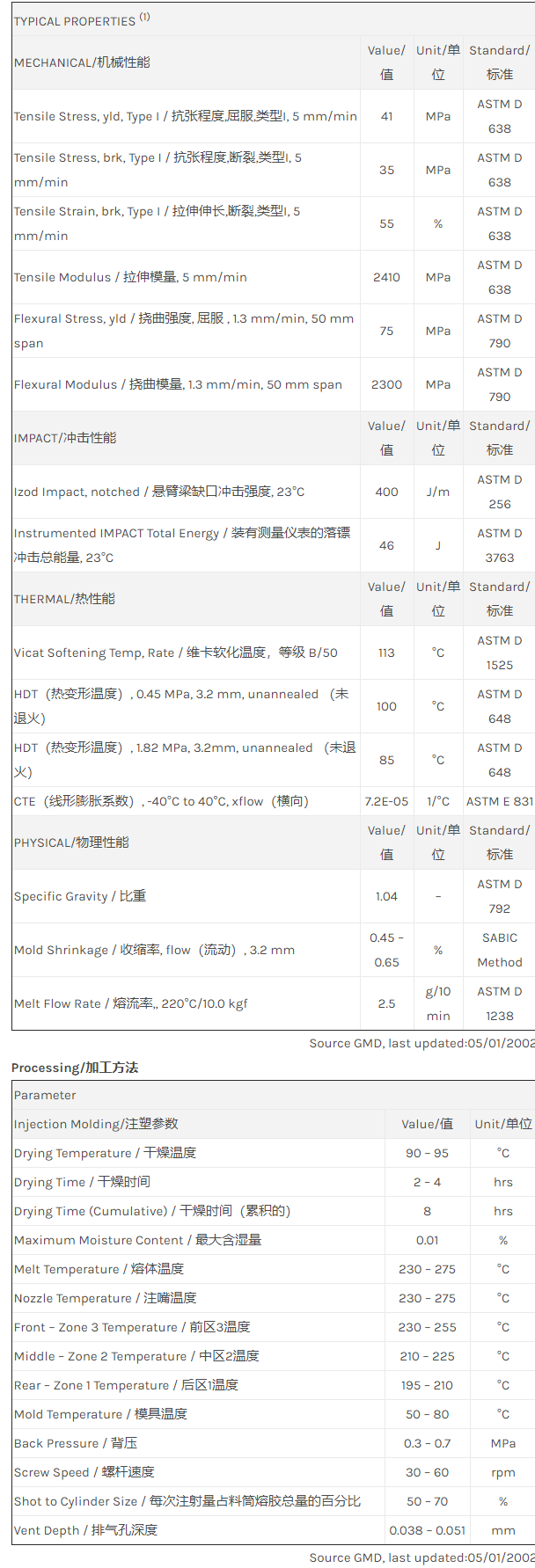 应用范围: 产品描述 Cycolac ABS GRM2600L物性表 “Cycolac GRM2600L 是一种丙烯腈丁二烯苯乙烯(ABS)产品,可以通过注射成型进行加工。 Cycolac GRM2600L 的应用领域包括包袋/内衬和电气用具。 特性包括:耐冲击、耐化学品” 相关颜色色号:GRM2600L-NA1000F High Impact , good chemical resistan