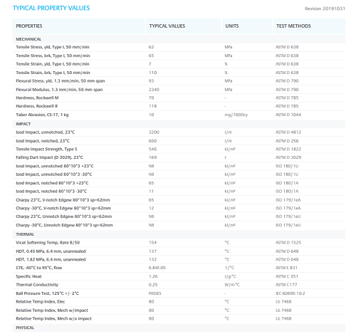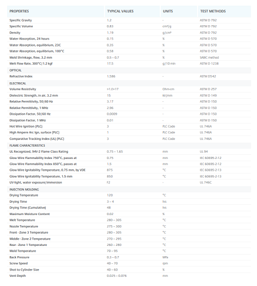 18 MFR. Improved flame retardance. Internal mold release. UV stabilized.